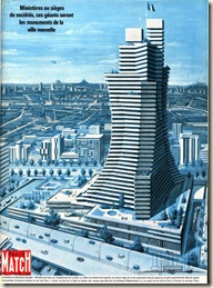 L’autre idée à la mode est l’avènement inéluctable des géants de béton façon tour Montparnasse. Le projet phare est le majestueux gratte-ciel de l’Education Nationale, 45 étages en gradins sur la rive gauche, à la prison de la Santé. L’Élysée, vieille bâtisse surannée pour recevoir ses hôtes illustres, doit céder la place à une dalle, située aux Invalides, portant une barre à vitres de verre, façon l’actuel ministère des finances à Bercy…