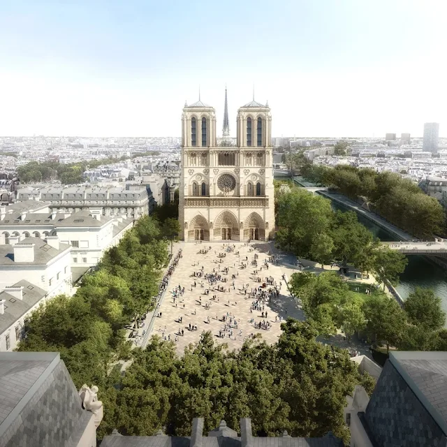 Parallèlement à la restauration de la cathédrale Notre-Dame de Paris, la Ville engage une réflexion pour revoir les abords de la cathédrale. L’enjeu est double : raccorder le monument à la ville, à la Seine, et surtout permettre d’accueillir dignement les 12 millions de visiteurs qui s’y rendent chaque année. Un concours international a été lancé en toute discrétion. Notre Dame est le monument le plus visité à Paris (car l'accès est pour le moment gratuit).